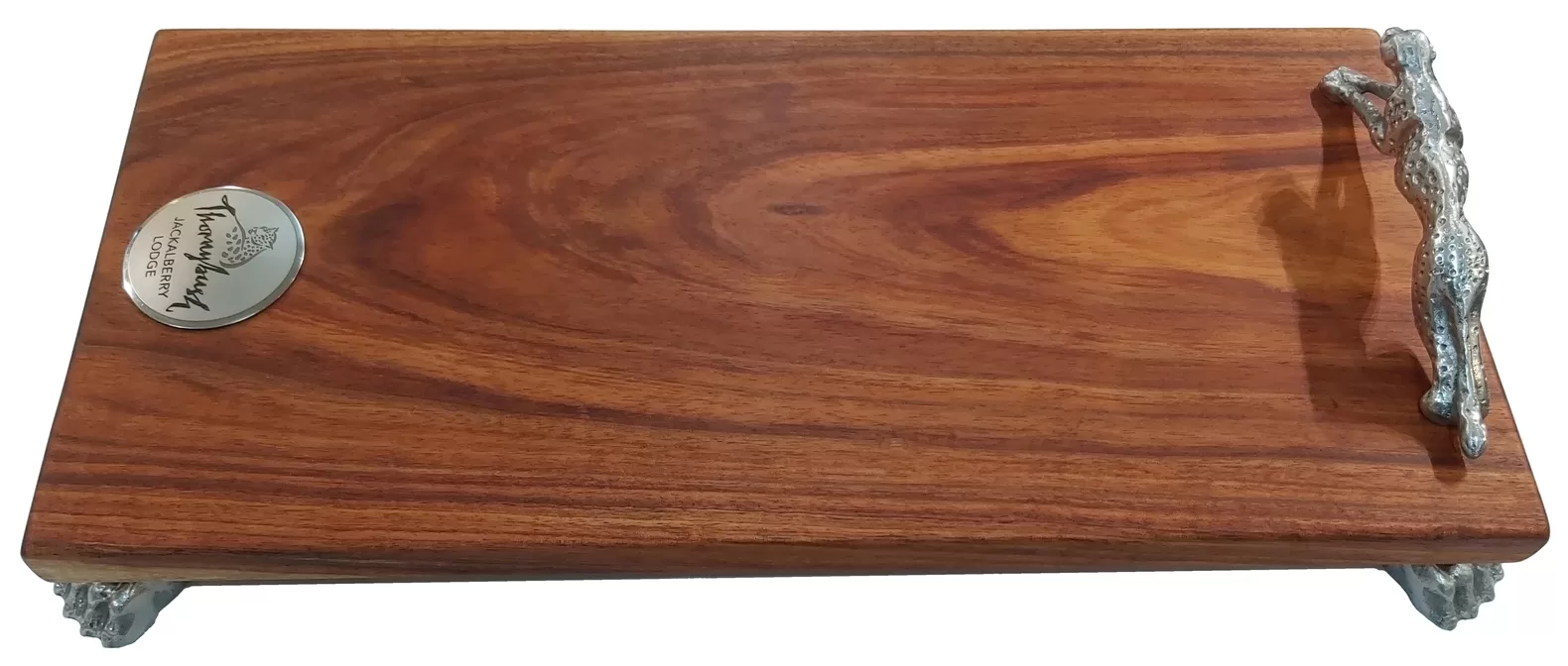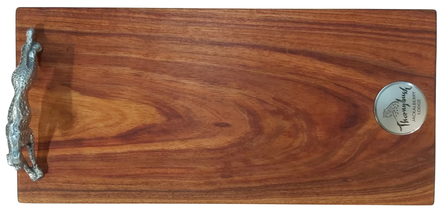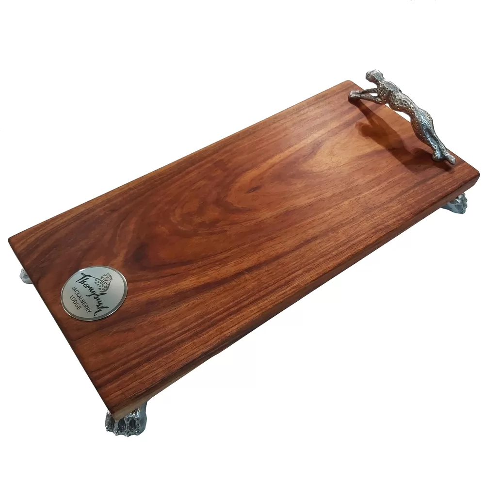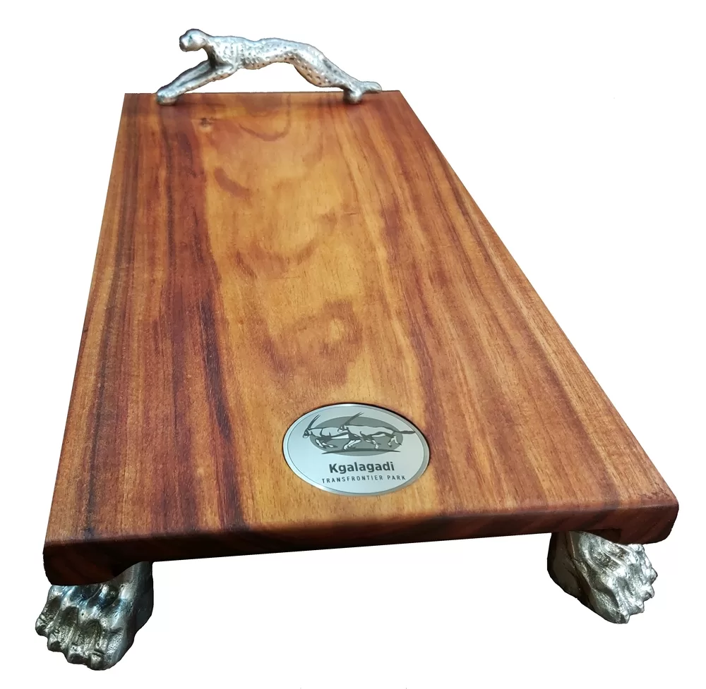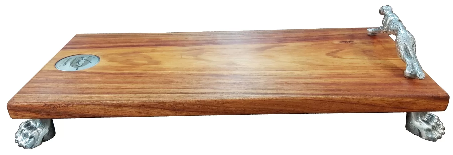 Zawadi personalises the boards, by engraving on the stainless steel disc your name and logo/picture. The disc is then permanently attached into a shallow recess on the board. Please contact us to arrange for personalised engraving. The cheetah sculpture and feet are made of solid aluminium, which is also food safe.