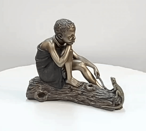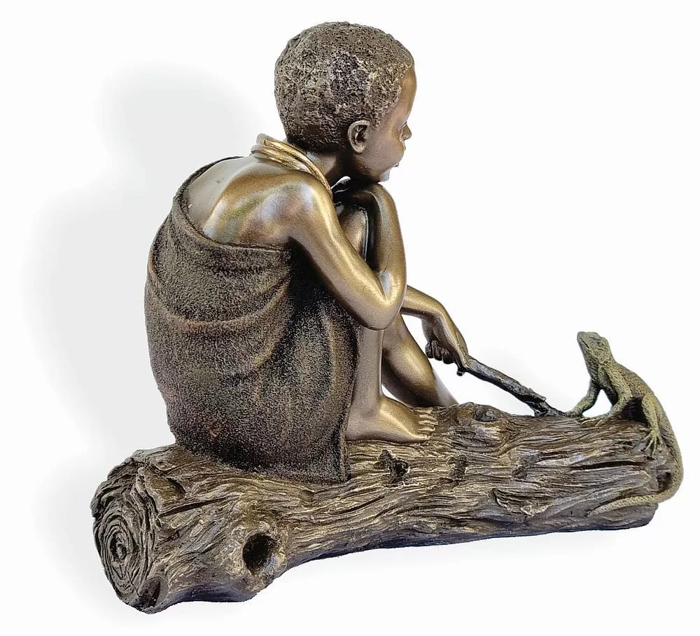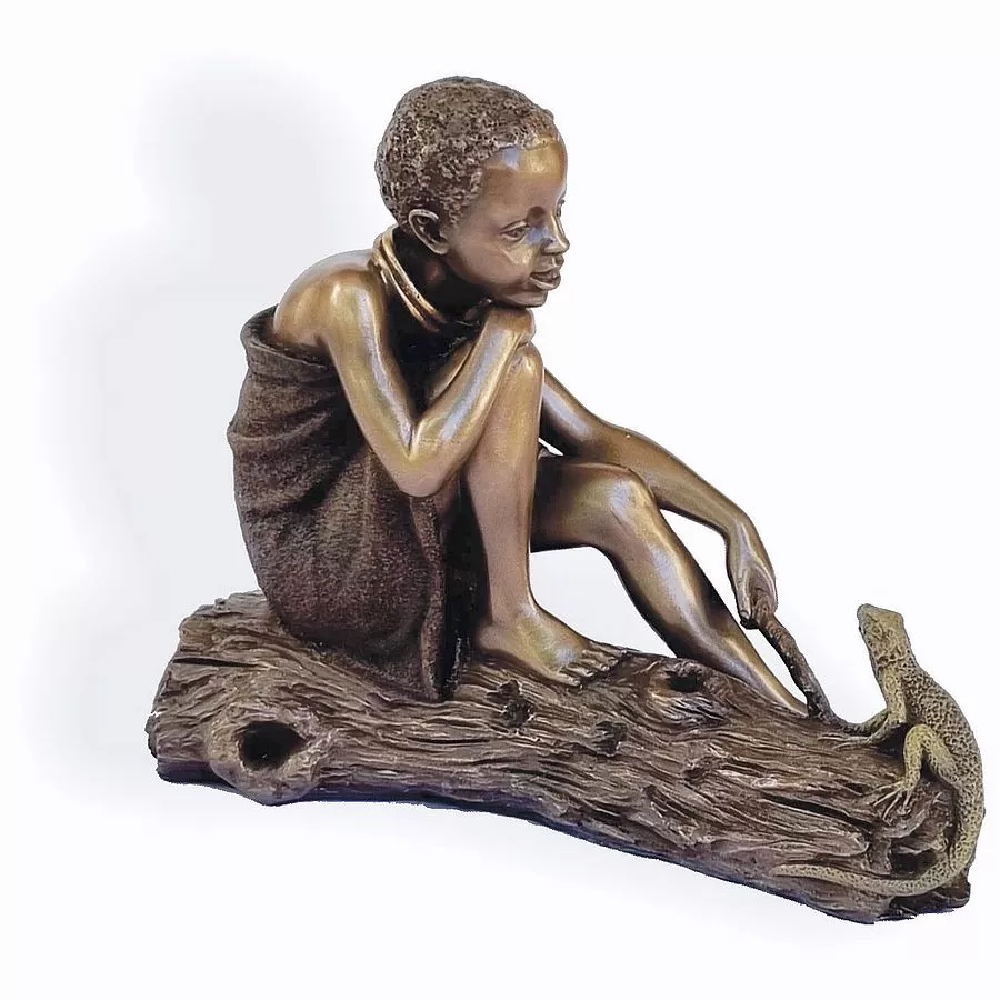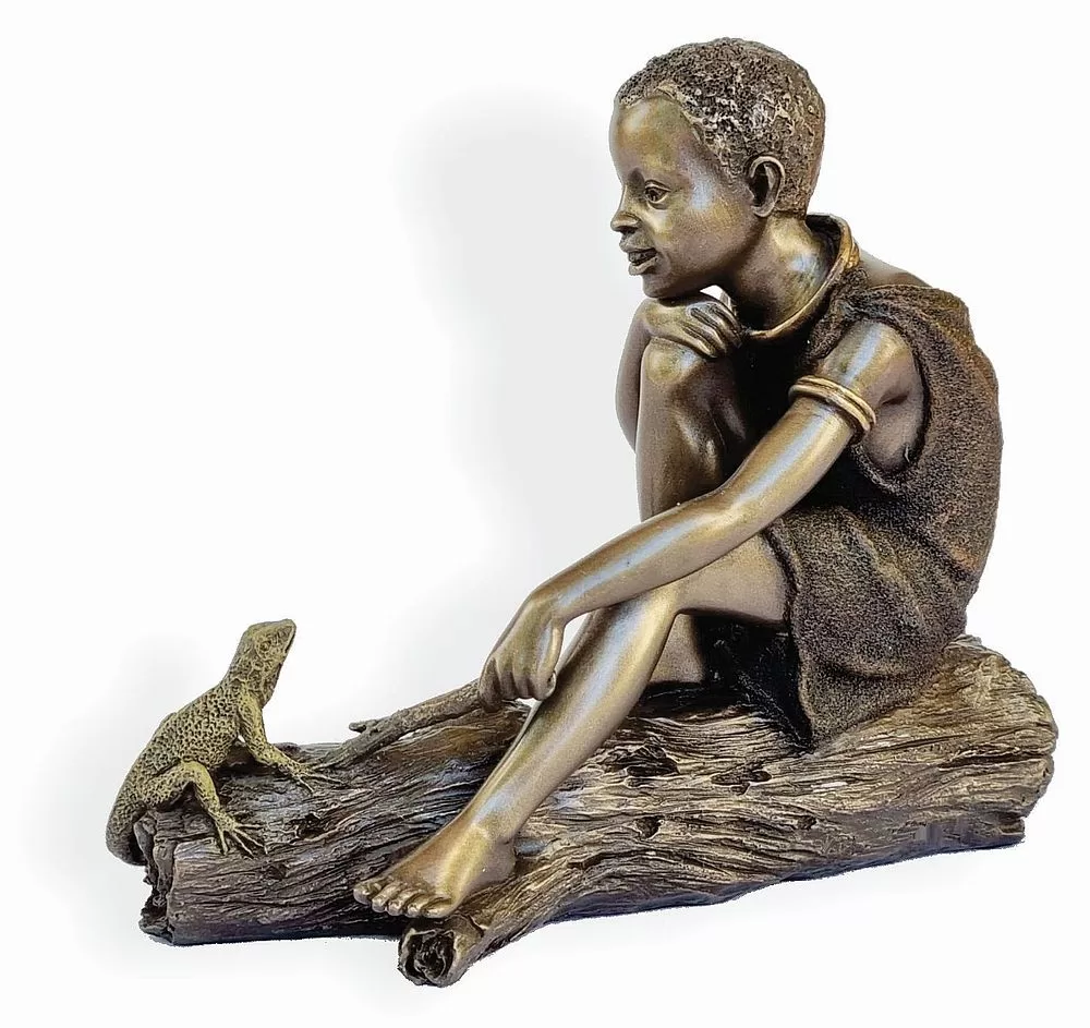 ‘Chance Encounter’ What a lovely surprise, a mjusi jumps up to join me on my log. He is as curious about me as I am about him, and if I listen very carefully, perhaps he will even speak to me. Cold-cast bronze sculpture of an African child.