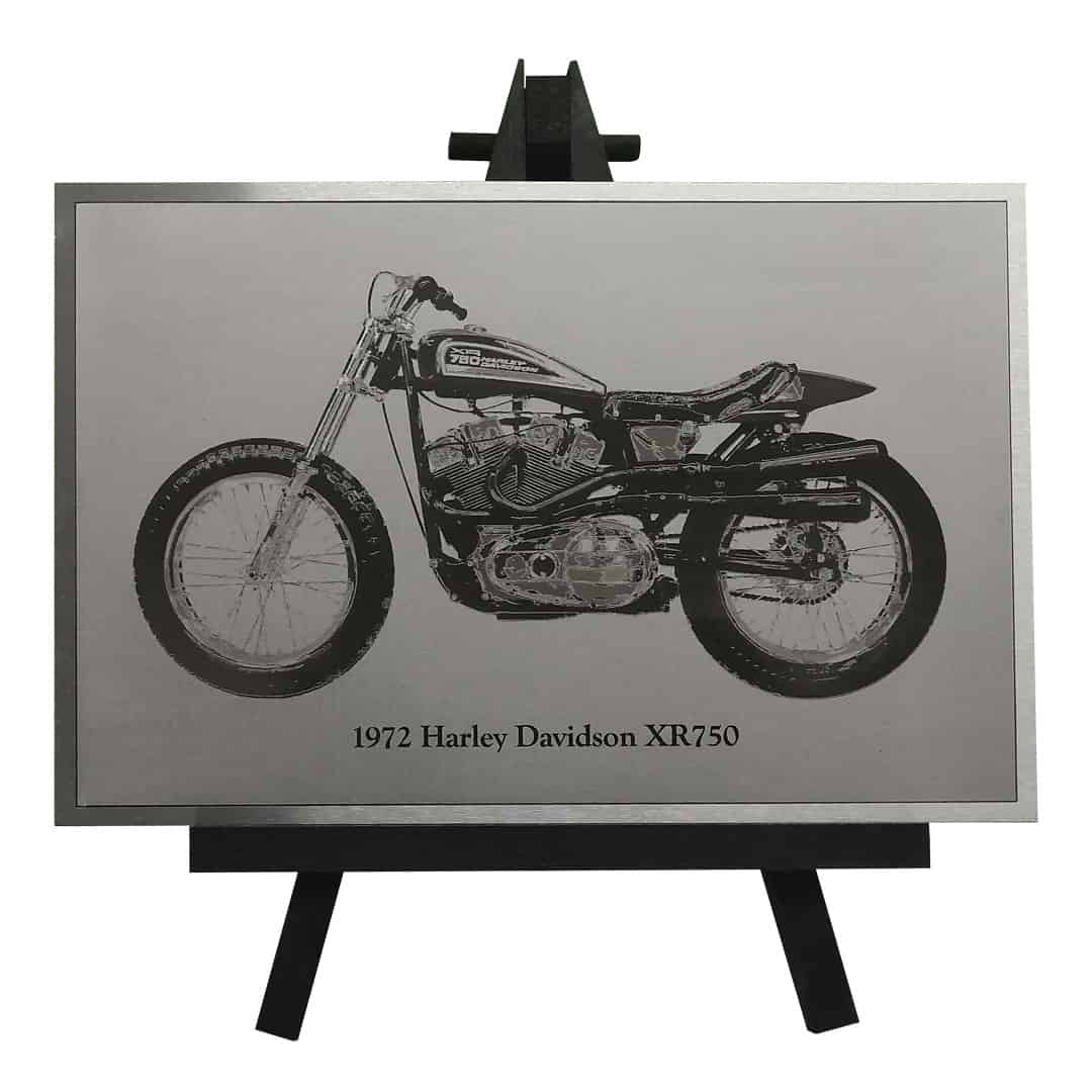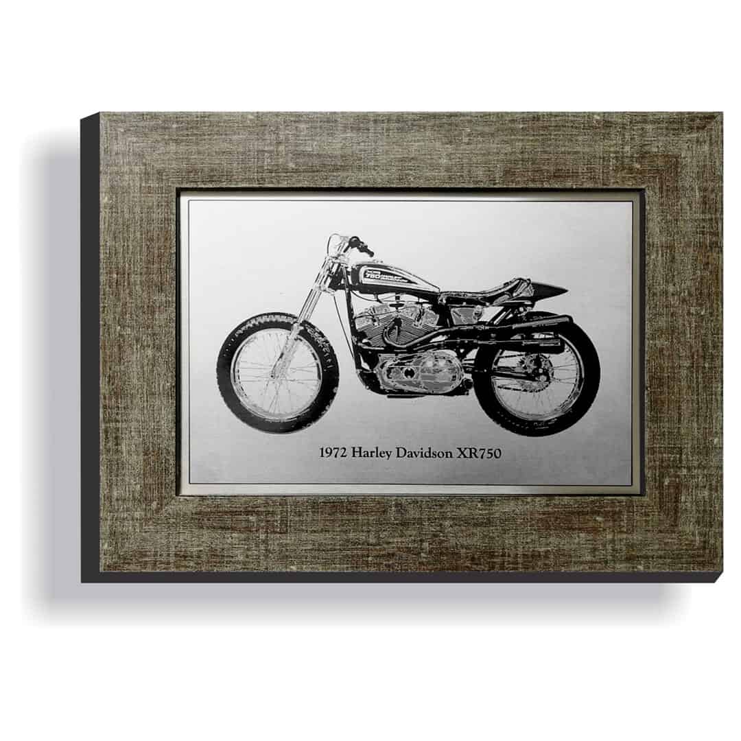 An engraved picture of the 1972 Harley Davidson XR750, which is a racing motorcycle made by Harley Davidson since 1970, primarily for dirt track racing, but also for road racing in the XRTT variant. The XR750 was designed in response to a 1969 change in the AMA Grand National Championship rules that leveled the playing field for makes other than Harley Davidson, allowing Japanese and British motorcycles to outperform the previously dominant Harley Davidson KR race bike. The XR750 went on to win the most races in the history of American Motorcyclist Association racing.