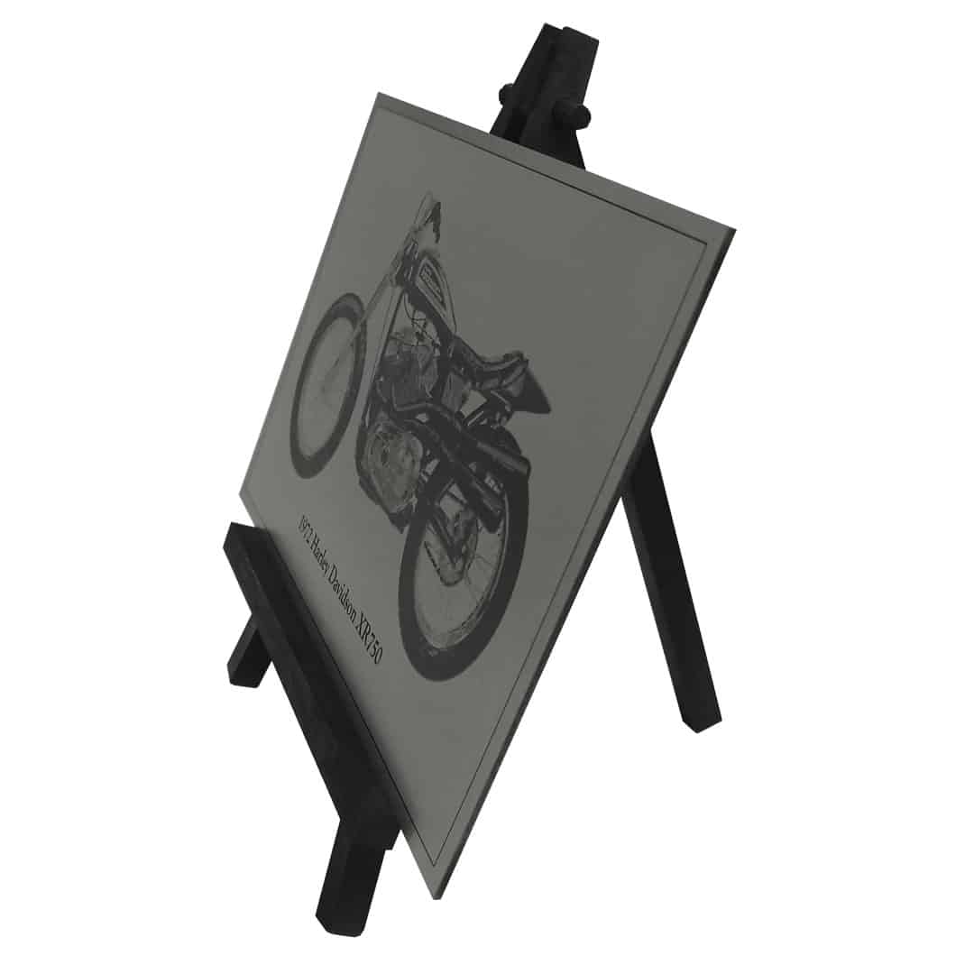 A laser engraved picture of a 1972 Harley Davidson XR750. Engraved on 304(18/10) Grade Stainless Steel. Framed, and supplied with an easel, it can be wall-mounted or free-standing. Personalised designs welcome. Frame size is 23,5cm x 17,5cm